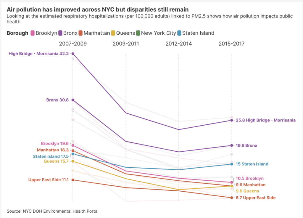 Issue: Environmental justice communities continue to bear the brunt of fossil fuel pollution, including from power plants, bus depots and heavy oil boilers. Burning heavy fuel oil to heat buildings releases multiple pollutants including PM2.5 with high levels of nickel, which when inhaled can have negative respiratory and cardiovascular health effects.6 Past initiatives like NYC’s Clean Heat Program successfully phased out dirty fuel oil in over 5,000 buildings, which significantly improved air quality in neighborhoods across the city.7 But major disparities persist in air pollution-related respiratory hospitalizations.