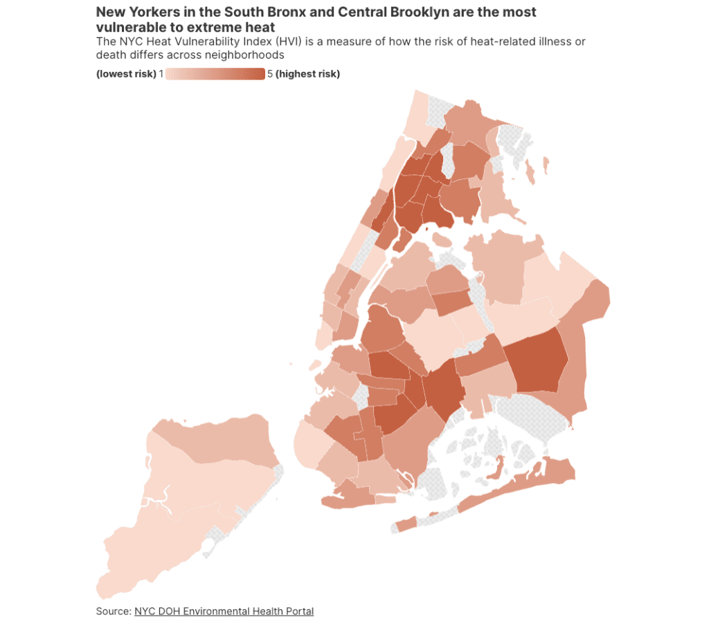 Issue: All New Yorkers are experiencing more frequent and longer heat waves, but our ability to manage and survive these events differs significantly. The Heat Vulnerability Index considers both geographical and socioeconomic factors to determine susceptibility to extreme heat events. Many of the city’s most heat-vulnerable neighborhoods are in Environmental Justice Areas.