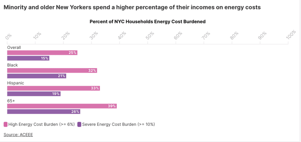 Issue: Almost two million households in the NYC metro area have a high energy cost burden, paying more than six percent of yearly income towards energy costs (ACEEE). Yet many residents still lack healthy and comfortable living spaces. Professor Diana Hernández refers to this reality as energy insecurity, to better capture how the inability to meet energy needs is tied to housing conditions, adverse health impacts and socioeconomic consequences, including the “heat-or-eat” dilemma facing many low-income households. In some cases, electrification could increase heating bills, and heat pumps make it feasible to measure and even bill for heating. Many types of affordable housing have strong rent protections, but policymakers must ensure electrification does not impose higher costs on vulnerable residents or exacerbate energy insecurity for already cost-burdened New Yorkers.