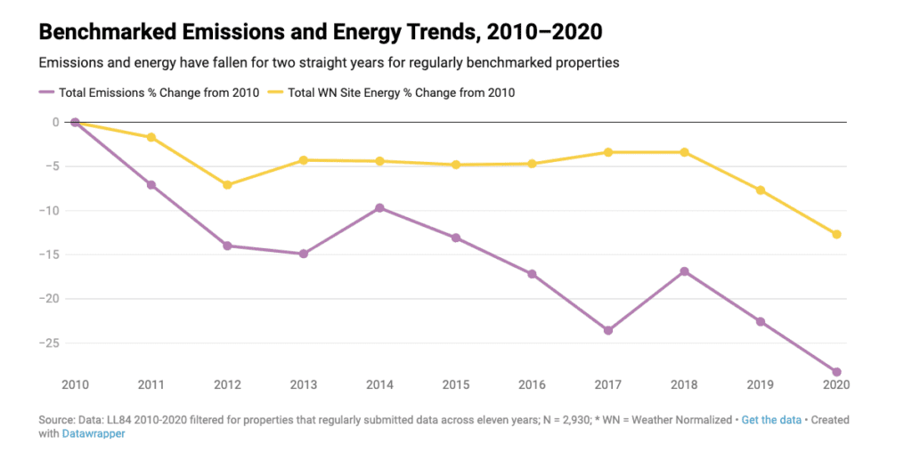 NYC site energy use and CO2 emissions both decreased in 2020.