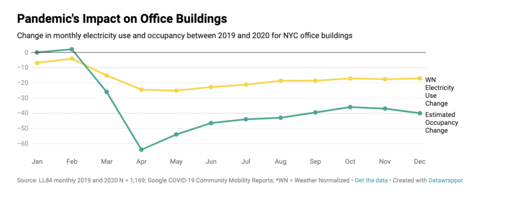 Weekdays in Manhattan usually mean streams of people flowing from apartments to workplaces. But in 2020, many people stopped commuting and stayed home. Annual electricity use in offices citywide fell by 16 percent as many lights, computers and other appliances remained off.
