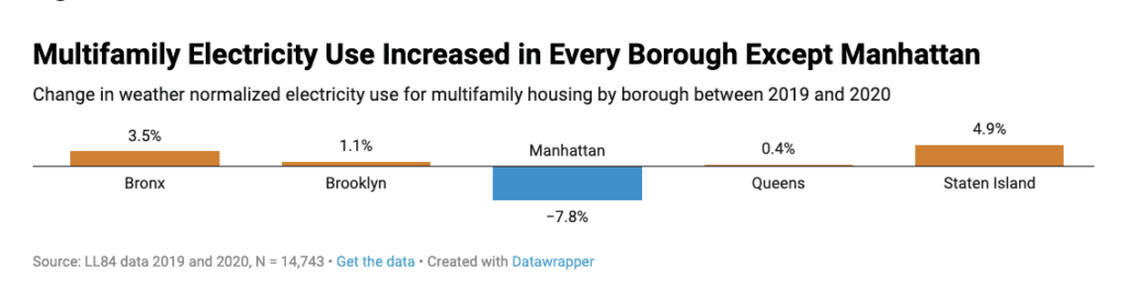 - Multifamily buildings varied widely in occupancy and energy use depending on their location. Total multifamily site energy use was up 2 percent, mainly due to burning fossil fuels. Surprisingly, multifamily electricity use fell 3.6 percent in 2020, but Manhattan skewed that result since its use fell almost 8 percent while all other boroughs increased.