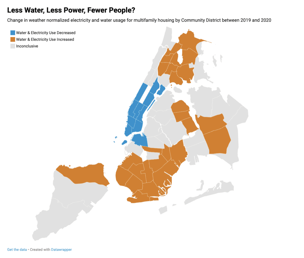 The map below shows the change in electricity and water use between 2019 and 2020 by community district, which have boundaries that are designed to align closely with NYC neighborhoods. Many districts in the outer boroughs experienced both an increase in electricity and water use, while most community districts in Manhattan saw decreases in both. It’s likely fewer people lived in these buildings in 2020. The city comptroller's office recently reported that the wealthiest New Yorkers—those living in areas with median incomes over $110,000—were 4.6 times more likely to leave the city than everyone else.5