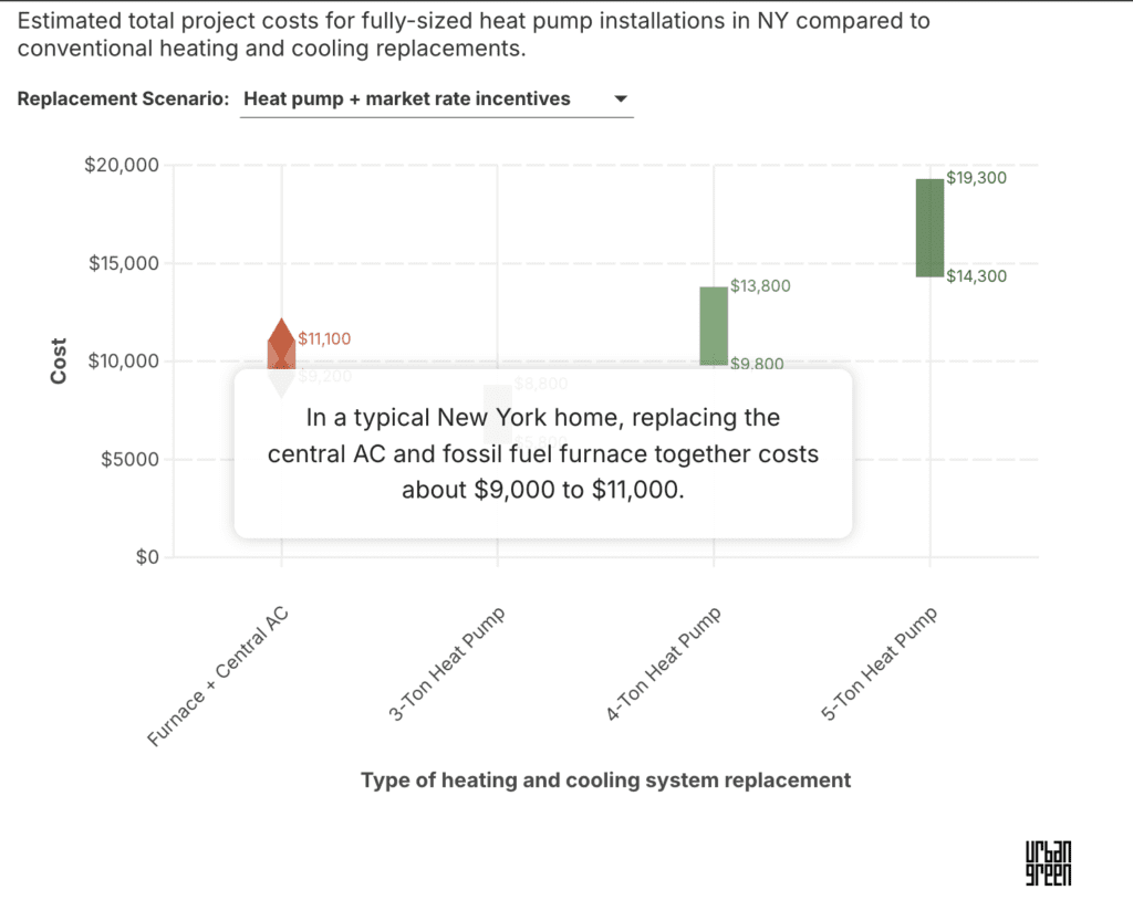 When New York homeowners make the leap to central heat pumps sized for full heating, upfront costs are often higher due to a larger heat pump and the potential ancillary envelope retrofits, duct improvements or electric upgrades. We estimate that before incentives, typical project costs for a fully sized ducted heat pump retrofit in New York range from about $5,000 to $6,000 per ton, including equipment, installation and ancillary upgrades.5