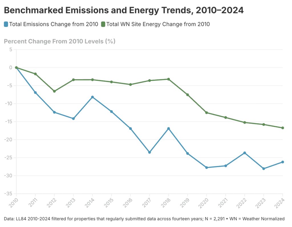 Energy use and carbon emissions from NYC’s largest buildings have fallen over the past 14 years. These metrics vary from year to year due to multiple factors, including the fuel mix for electricity generation and variable weather. However, they have both trended down due to more efficient energy use, improved district steam production and delivery, and accelerated fuel switching.