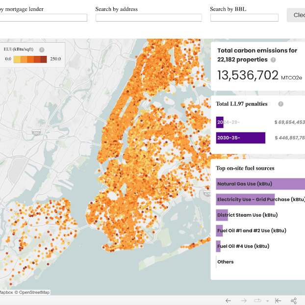 Most buildings in NYC have a mortgage that is held by a bank or financial institution. But historically, these institutions have had limited visibility into the carbon intensity of the buildings in their portfolio. The Decarbonization Compass, a partnership between Urban Green and NYU Stern Center for Sustainable Business, changes this by bringing together NYC’s building energy use and mortgage lienholder data in an interactive data tool.